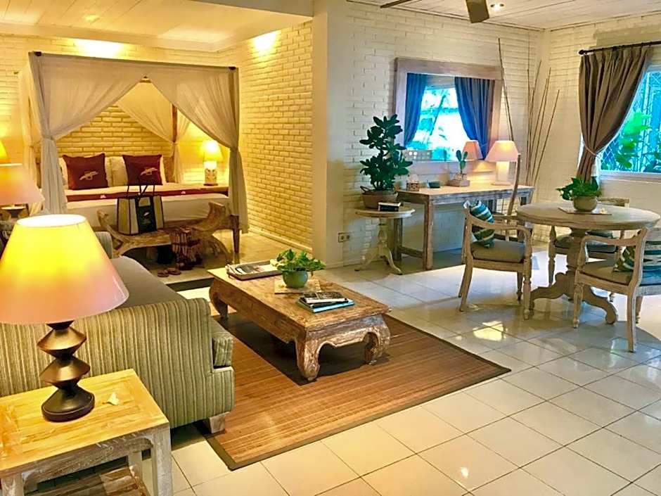 Fitted with antique wooden and rattan furnishings, this air-conditioned room is more spacious. It features a fridge, mini-bar and a large seating area with a sofa. Views of the pool and the sea can be enjoyed from the private terrace and balcony.